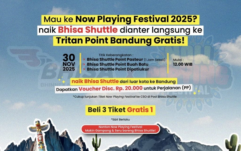 BHISA.ID – Punya rencana ke Now Playing Fest 2025 di Bandung? Jangan khawatir soal transportasi, karena Bhisa Shuttle siap jadi teman perjalananmu yang paling praktis dan hemat! Khusus di bulan November 2025, Bhisa Shuttle kasih penawaran spesial buat kamu yang mau datang ke festival musik paling hits ini. Dari luar kota ke Bandung jadi makin gampang, nyaman, dan terjangkau!
